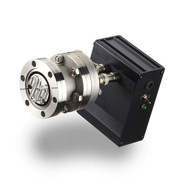 An external assembly houses the UV emitter, which is situated just behind a high UV transmission, ultra-high vacuum window. A mirror on the back side of the emitter further improves the transmission of 185 nm UV radiation through the window and into the vacuum chamber. The ZCUVE housing is backfilled with an inert gas to prevent ozone production within the housing. Finally, the emitter leads are connected via MHV high voltage connectors to the control.