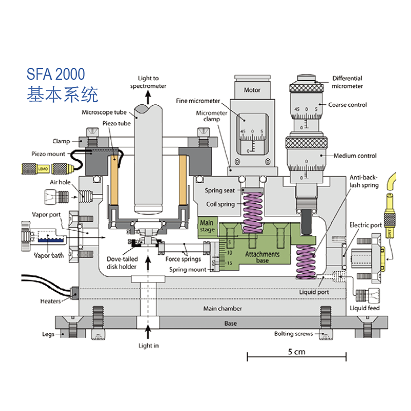 SFA通過超高靈敏度(nN)和超高距離分辨率(1Å=0.1 nm)的探頭來測量蒸汽或液體中兩個表麵之間的應力。 它也可以在分子級別(納米級)內實時測量因表麵應力,動態相互作用(諸如:粘力和摩擦力,薄膜